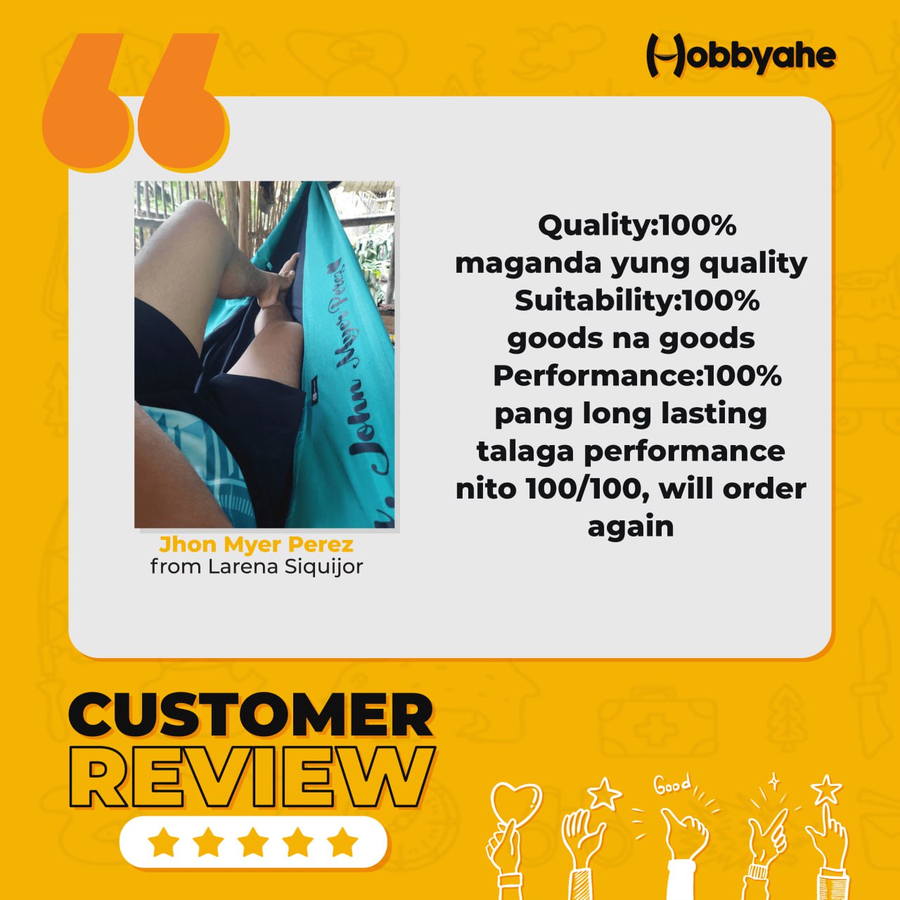 Satisfied customer here🧡 , Subrang relax po..... More than just a hammock, i can no longer go out for a solo trip without it. Very comfortable and relaxing🧡 , Thanks for this.....one of my officemates already ordered 1 piece after my recommendation... Please beep me up if you have featured it so that i can share it too🧡